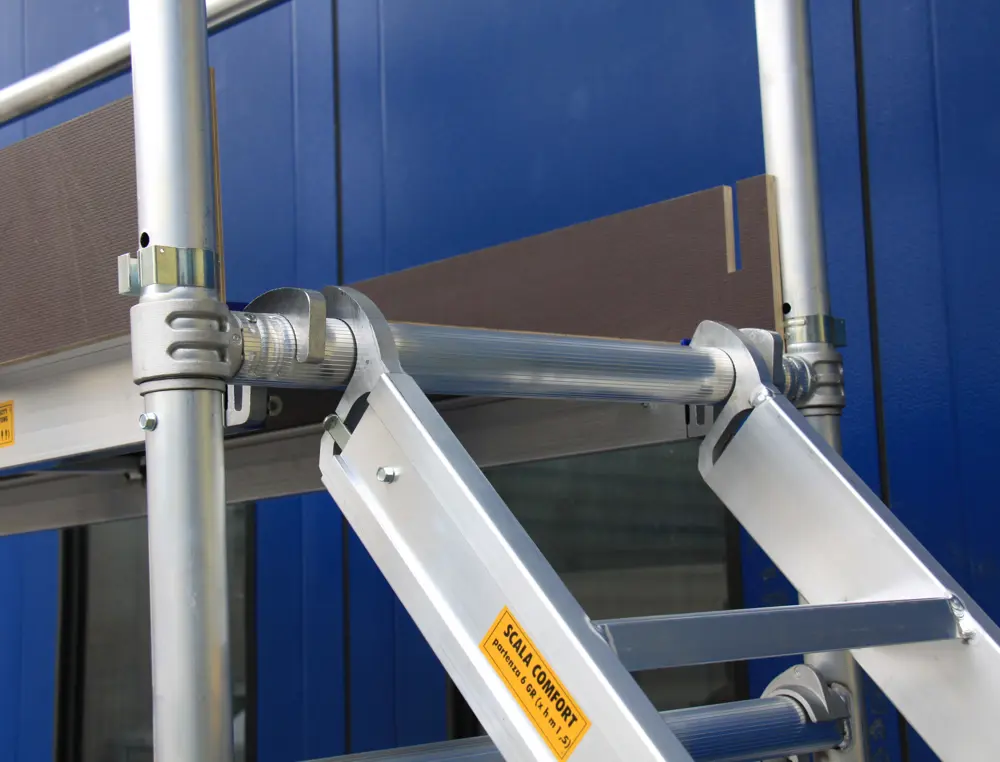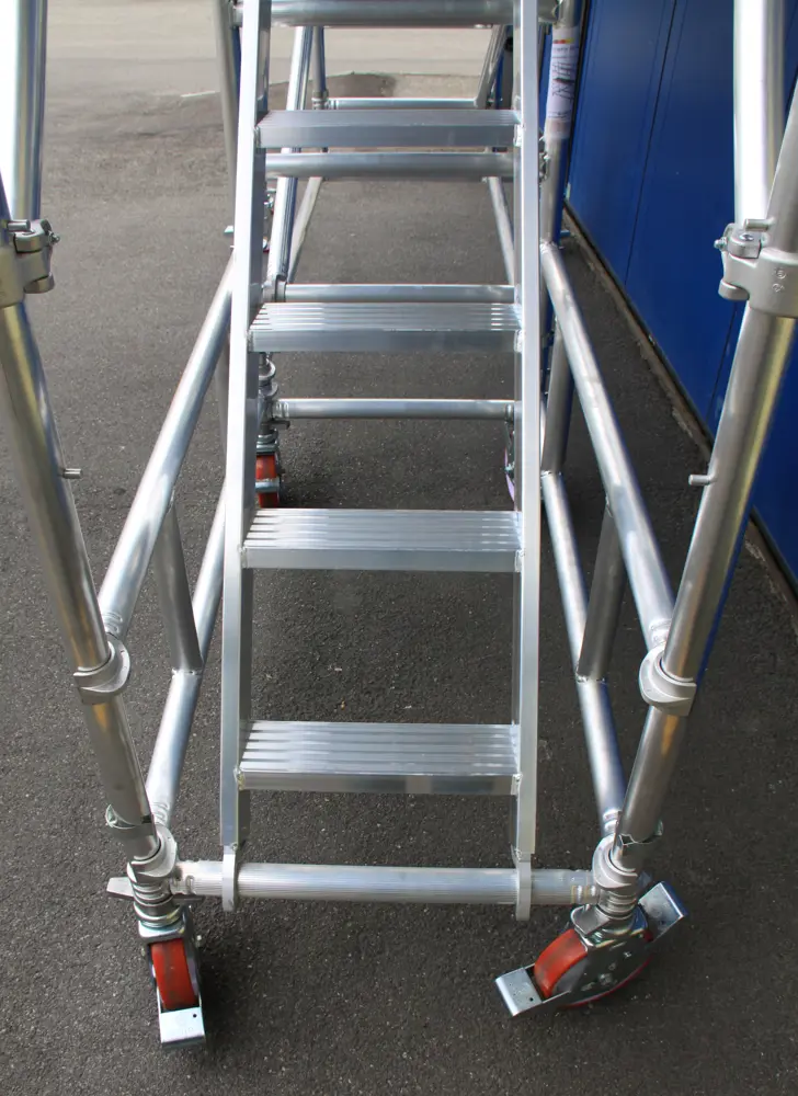 Version de l’échafaudage TEMPO avec une échelle fonctionnelle qui permet l’accès aux opérateurs les mains libres.