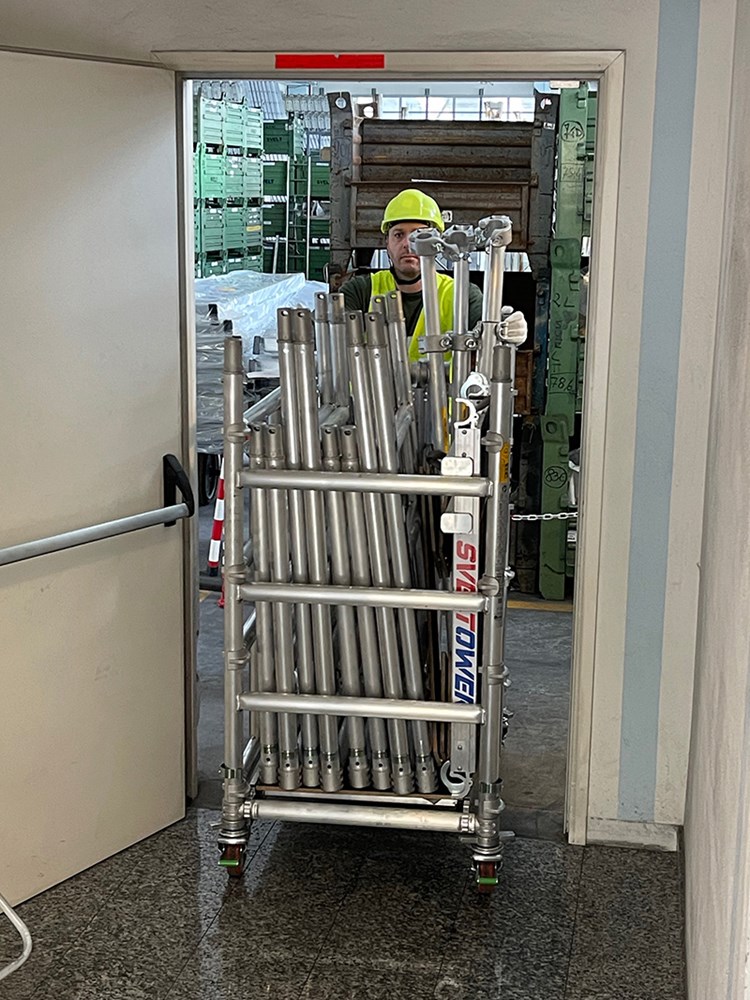 Une fois téléchargé, le module de base Sveltower devient un chariot capable de transporter tous les composants nécessaires à l'assemblage jusqu'au lieu de travail à sa hauteur maximale. Le chariot constitue la base de l'échafaudage à monter. Avec seulement 74 cm de large, il passe par les portes et les couloirs et s'intègre dans les ascenseurs et les fourgonnettes standard.