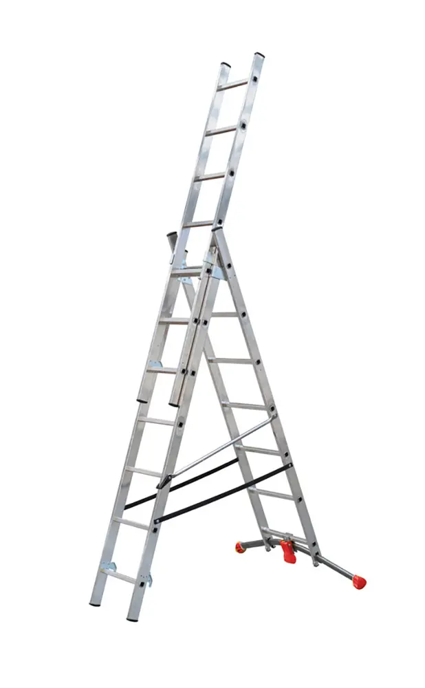 Échelle en trois sections, position dans l’échelle de support, double et boiteuse grâce à l’élargisseur de base réglable par pédale.
