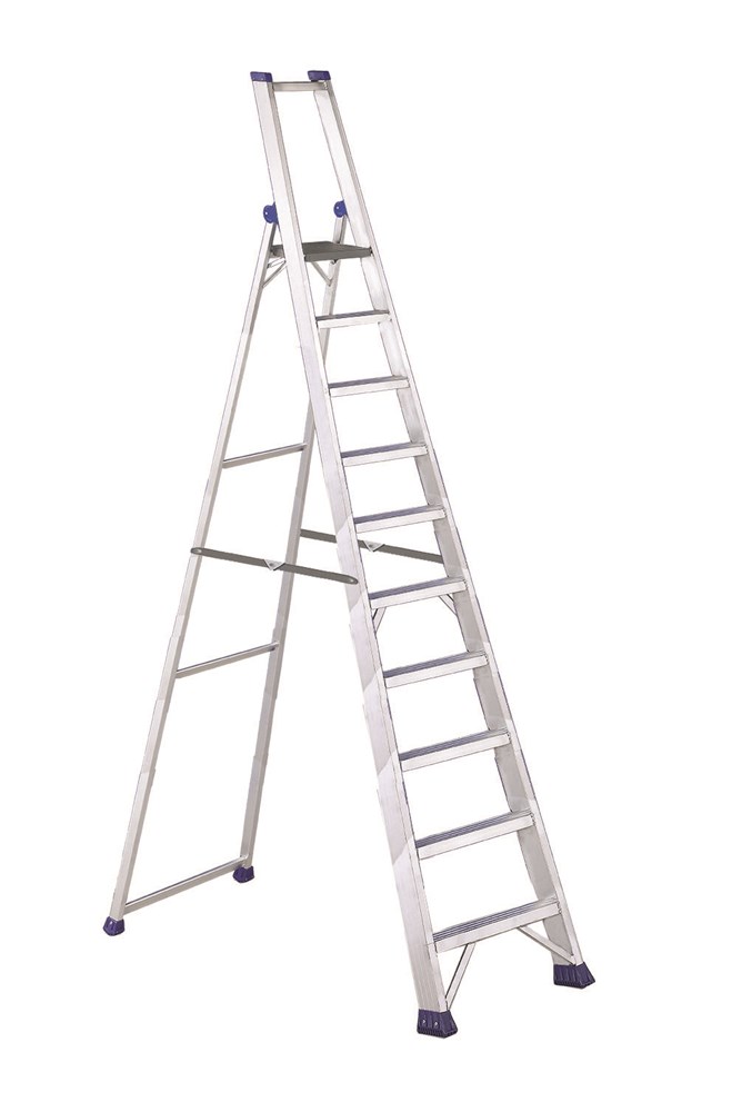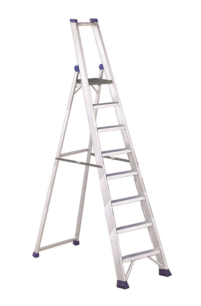 Escabeau avec garde-corps, plate-forme et marches antidérapantes.