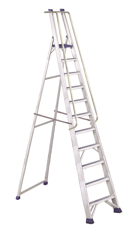 Escabeau équipé de marches, doté d’une plate-forme, d’un garde-corps et d’une main courante.