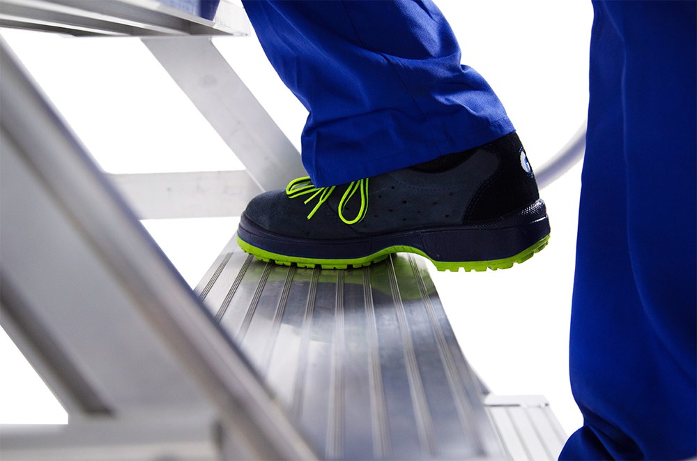 Le dossier est quasi perpendiculaire au terrain de façon à permettre à l’opérateur de s’approcher frontalement du mur ou de la machine. Système de freinage automatique en marche lorsque l’échelle est en position de travail. L’échelle peut ainsi être poussée par l’opérateur jusqu’au lieu de travail.