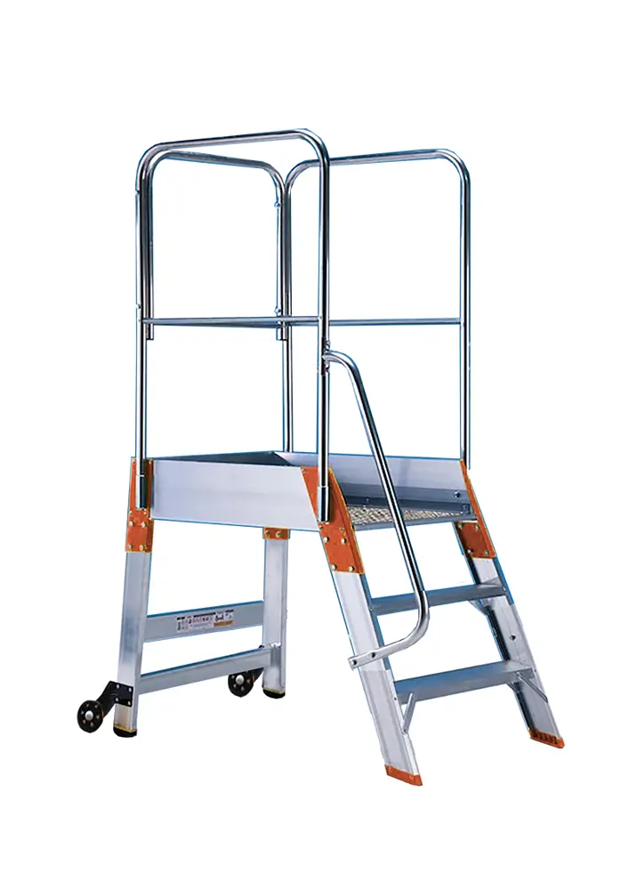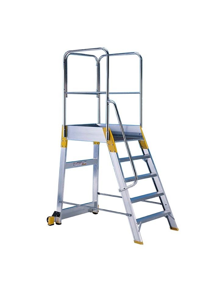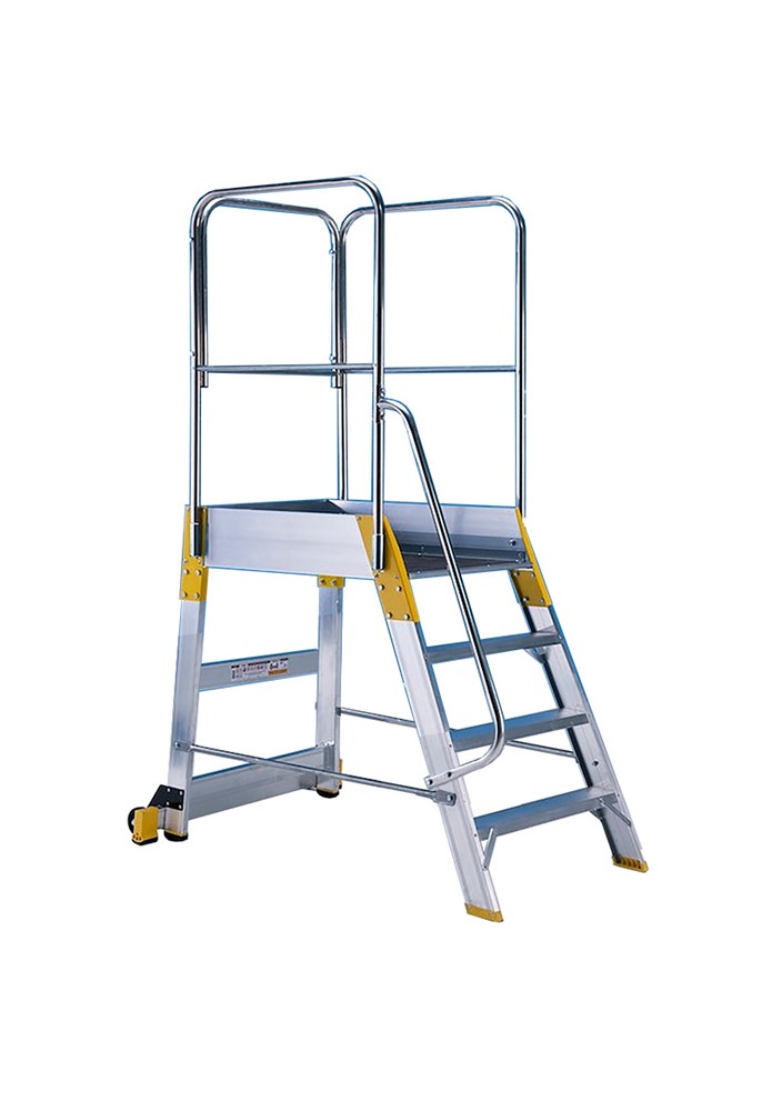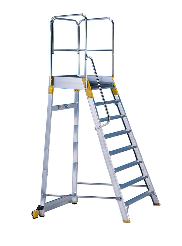 La conception de ce produit permet à l’opérateur de s’approcher frontalement du mur ou de la machine. Système de freinage automatique en marche lorsque l’échelle est en position de travail.