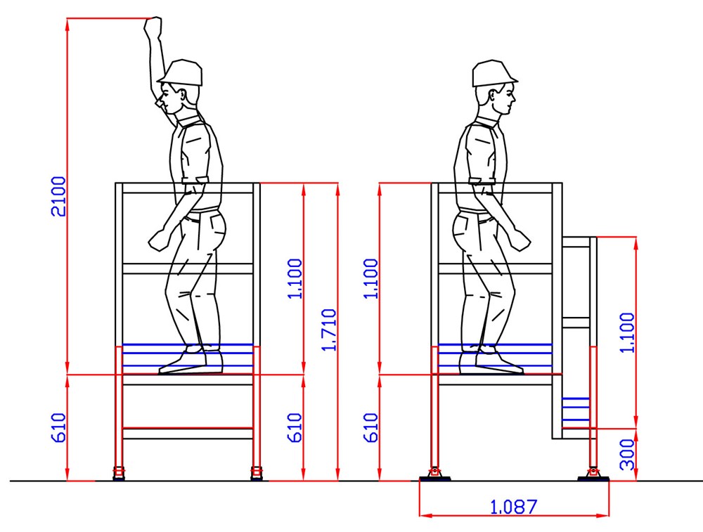 Équipé de pieds télescopiques réglables tous les 5 mm qui vous permettent de travailler précisément à la hauteur variable de machines spéciales ou de travailler dans les escaliers, les trottoirs, les gradients ou même en présence d'obstacles encombrants présents à proximité des lignes de production.