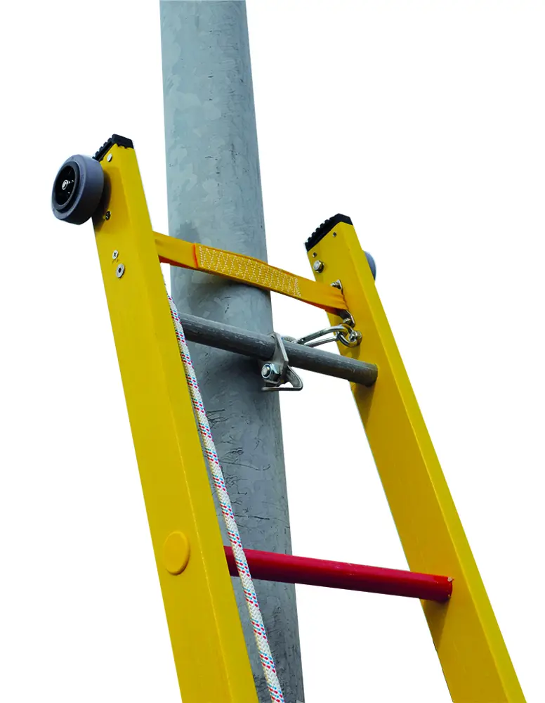Poste de travail 100 % isolant en fibre de verre (montants/échelons). Point d’attache pour EPI antichute. Pour une utilisation sur des poteaux en bois