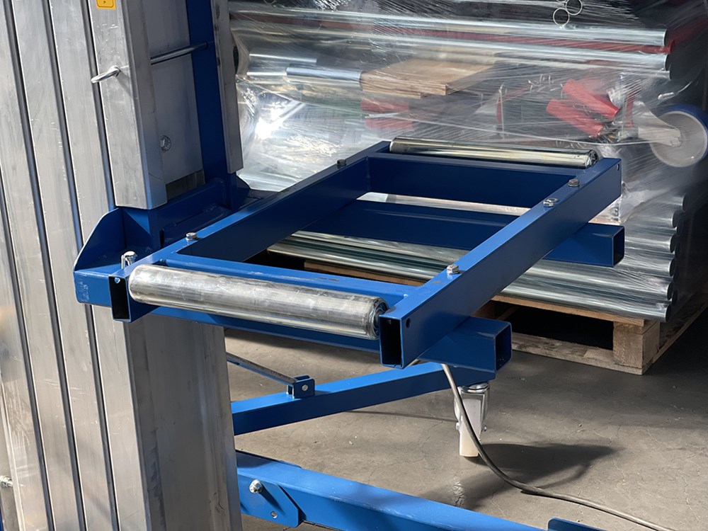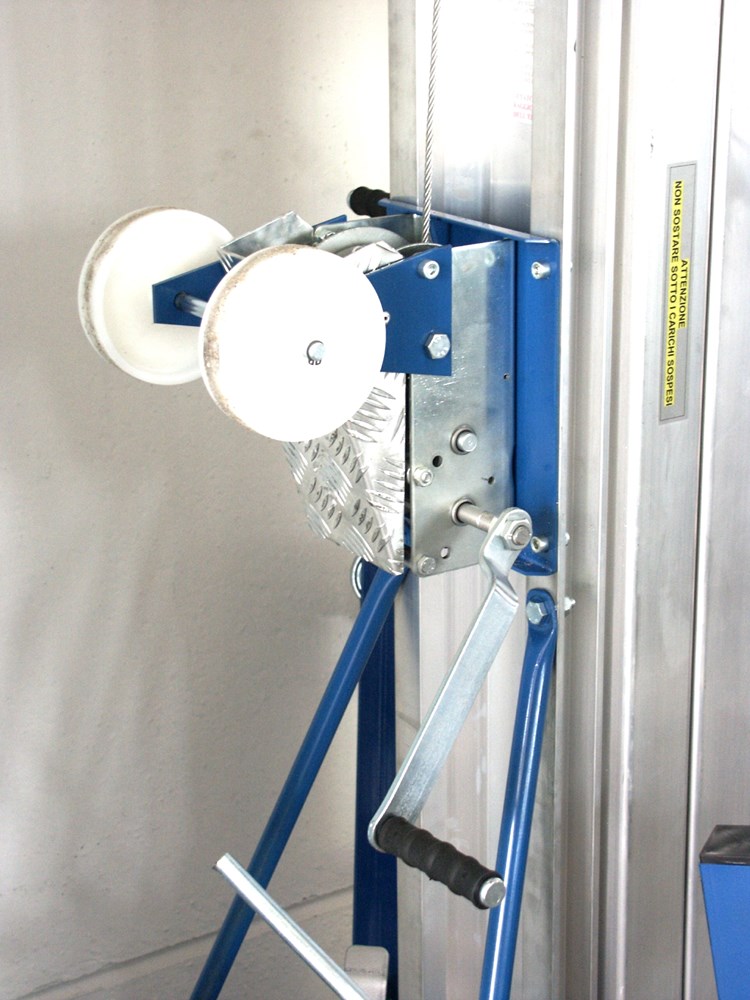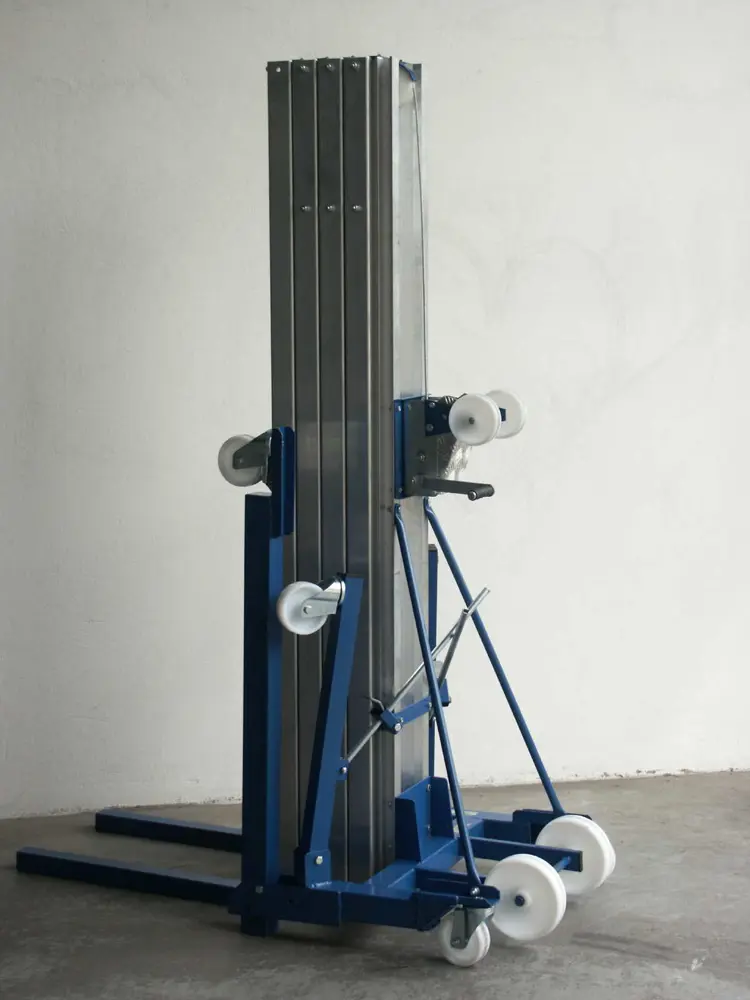 Elévateurs de matériaux manuels portables avec châssis en acier et colonne en aluminium, indiqués pour le levage et l’installation d’éléments pour faux plafonds, néons, éclairages industriels, climatisations, goulottes, conduits, tubes et poutres, enseignes et panneaux publicitaires, pièces de machine et palettes.