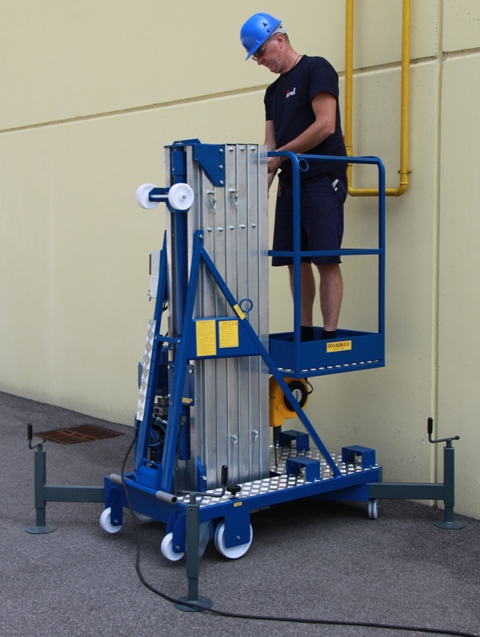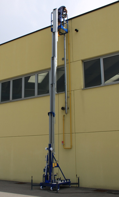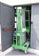 Plateformes aériennes verticales portables, alimentation à courant alterné (ou continue en option) pouvant s’actionner de la plateforme par des commandes faciles d’accès. Les dimensions réduites d’encombrement permettent de passer aisément à travers les portes, couloirs ou espaces étroits. Le mât est monté sur des rouleaux en nylon autolubrifiants afin de limiter au minimum le jeu et ainsi obtenir une stabilité maximale, et cela même dans des conditions de températures extrêmes (chaleur ou froid). Elles peuvent être déplacées manuellement et chargées sur les véhicules grâce au système de basculement qui en facilite le chargement.