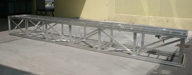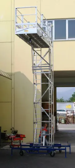 Le cadre en acier peint supporte une colonne en aluminium nervuré avec une plate-forme en aluminium avec des parapets qui peuvent être ouverts de tous les côtés.