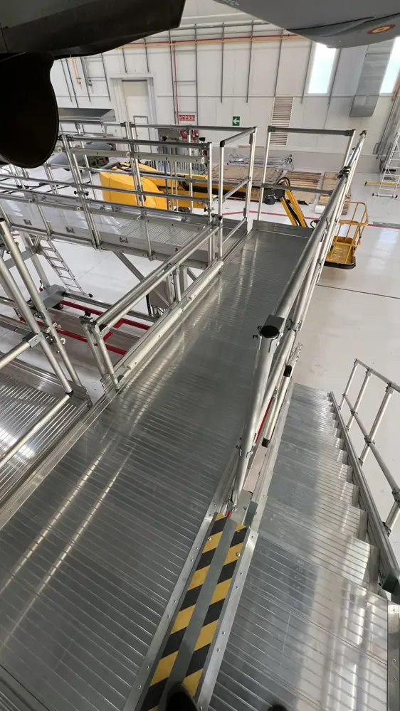 Des structures spéciales avec une base en acier et une structure en aluminium constituent diverses passerelles à différentes hauteurs pour l’entretien et la construction des avions.
