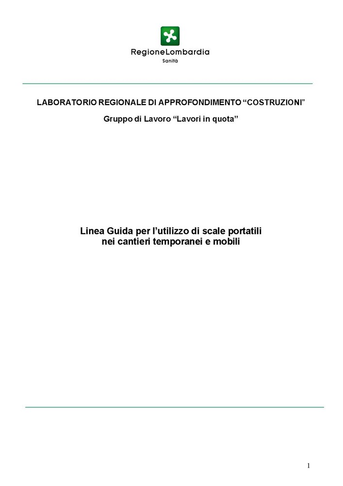 Scopo della presente Linea Guida è fornire ai diversi soggetti operanti nel cantiere uno strumento semplice ed operativo da consultare nel corso delle diverse tipologie del lavori che di volta in volta richiedono l’utilizzo di scale portatili. Non rappresenta, pertanto, riferimento tecnico-giuridico agli “addetti ai lavori”, essendo tale esigenza ormai ampiamente coperta dalle norme specifiche del D.Lgs 81/08 e dal relativo Allegato XX, dalla norma tecnica UNI EN 131 Parte 1° e 2°, nonché dalla Linea Guida ISPESL “per la scelta, l’uso e la manutenzione delle scale portatili” del Settembre 2004.