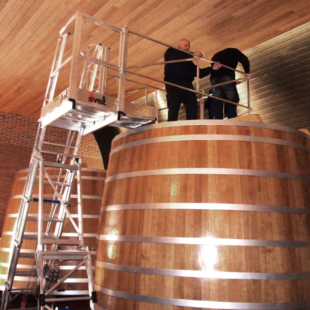 Ancora una volta abbiamo stupito il nostro cliente realizzando una scala telescopica ideale per le operazioni sui grandi tini e botti di vino. La scala si adatta in altezza a diverse tipi di botti. Inoltre è pieghevole per poter essere estratta dalla cantina e riposta in un apposito garage. lo sbarco laterale è consentito da un cancelletto con piattaforma a sbalzo. Il lavoro sul tino è protetto da un guardacorpo di 2 metri per 2 metri che avvolge l'operatore evitandone il rischio di caduta.