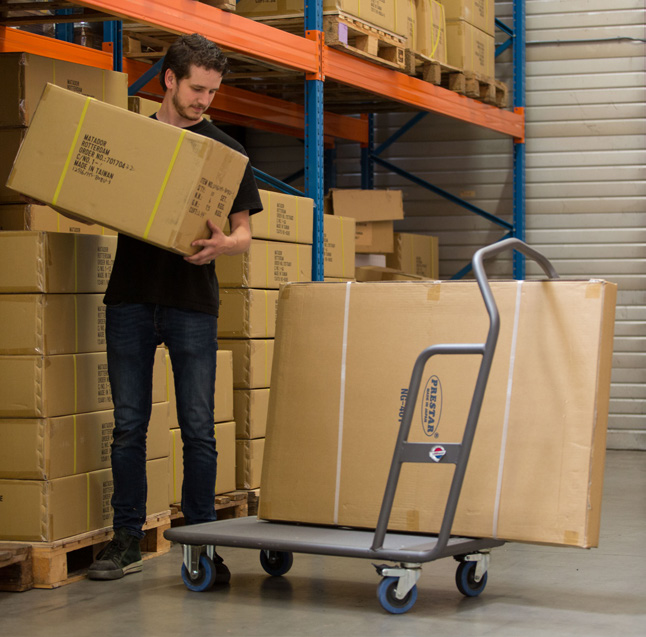 Prodotto con un telaio in acciaio verniciato e un piano rinforzato consentono di spostare comodamente grossi pesi in giro per il magazzino con il minimo sforzo dell'operatore che mantiene una postura perfetta che ne evita problemi di salute.