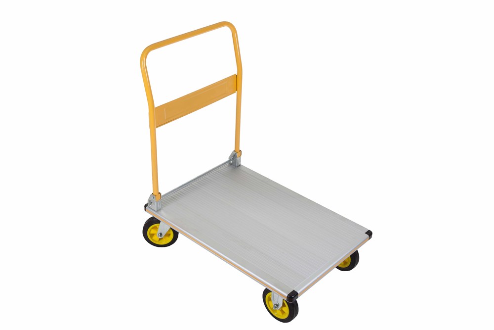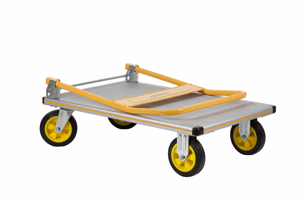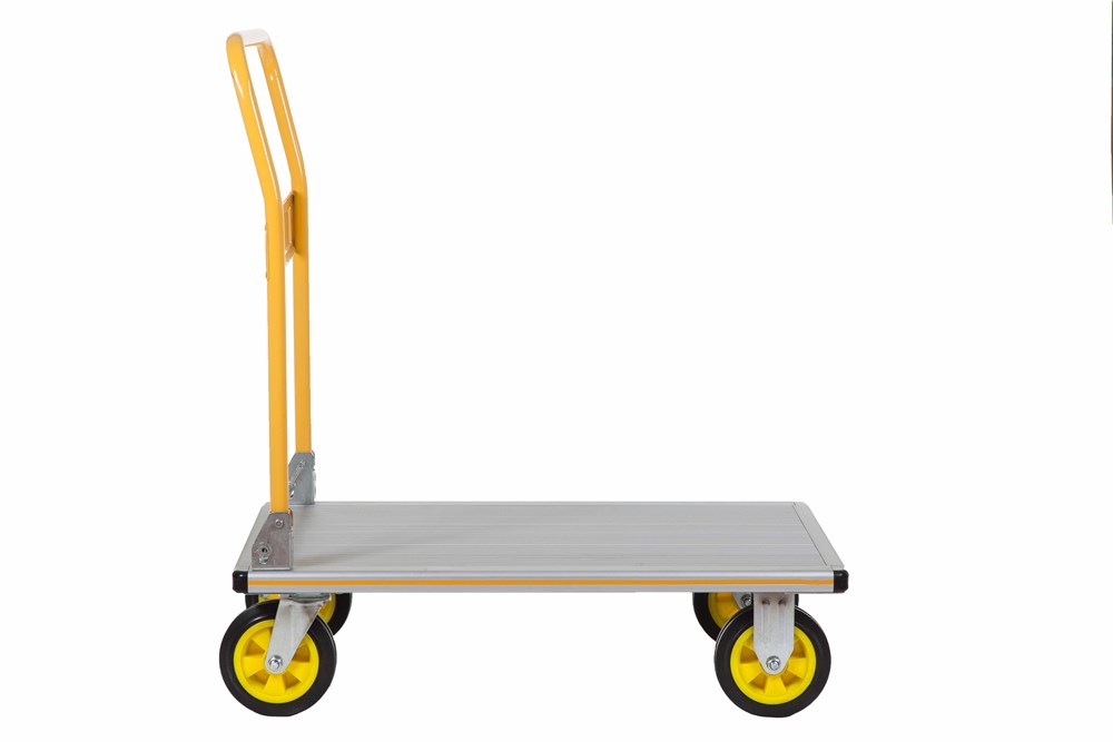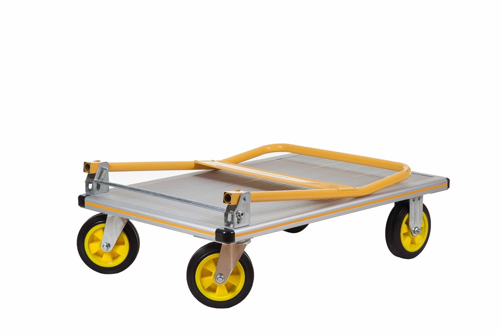 Carrello professionale a 4 ruote con pianale. Dotato di maniglione che si apre in pochi secondi. Compatto per un comodo trasporto. Design robusto fatto di alluminio leggero e resistente. Robusto maniglione rigido in acciaio per manovre sicure dei carichi. Costruito per magazzini commerciali, negozi al dettaglio e corrieri.