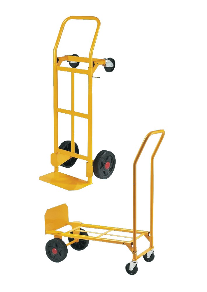 Trasformabile per utilizzo in verticale per cassette e pacchi e in orizzontale su 4 ruote per carichi voluminosi.