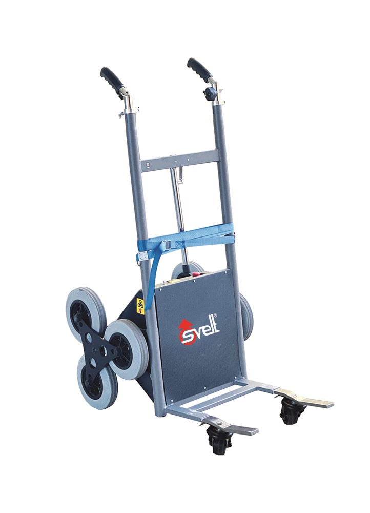 Carrello elettrico saliscale professionale con ruote a stella, ergonomico, con accessori per elettrodomestici, infissi e porte.