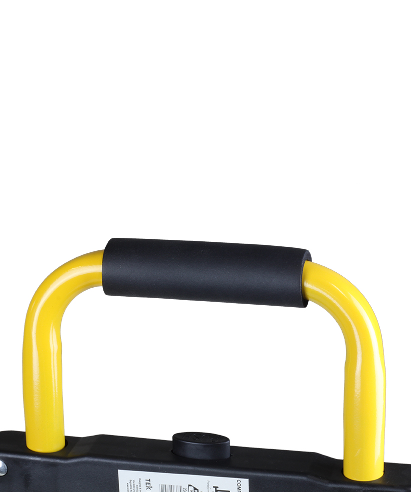 Carrello saliscale pieghevole in robusto acciaio verniciato con polveri epossidiche di color giallo.