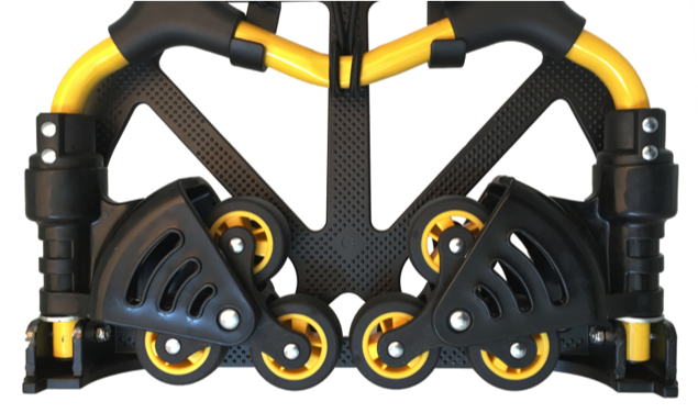 Carrello saliscale pieghevole in robusto acciaio verniciato con polveri epossidiche di color giallo.
