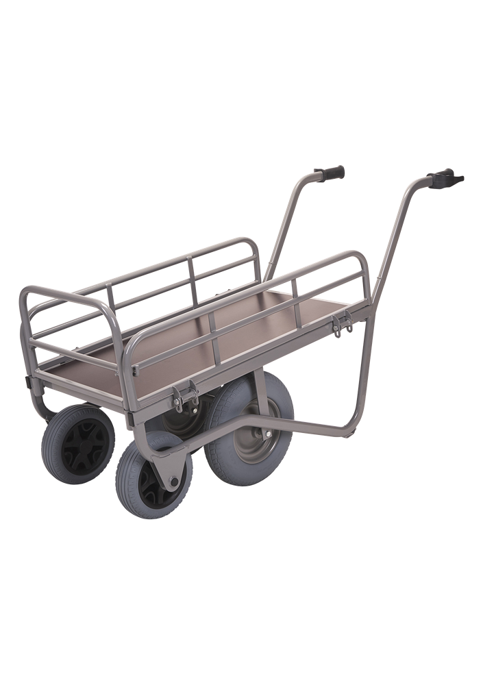 Carrello agricolo compatto dotato di sponde laterali regolabili e ruote antiforatura, progettato per garantire versatilità e durata.