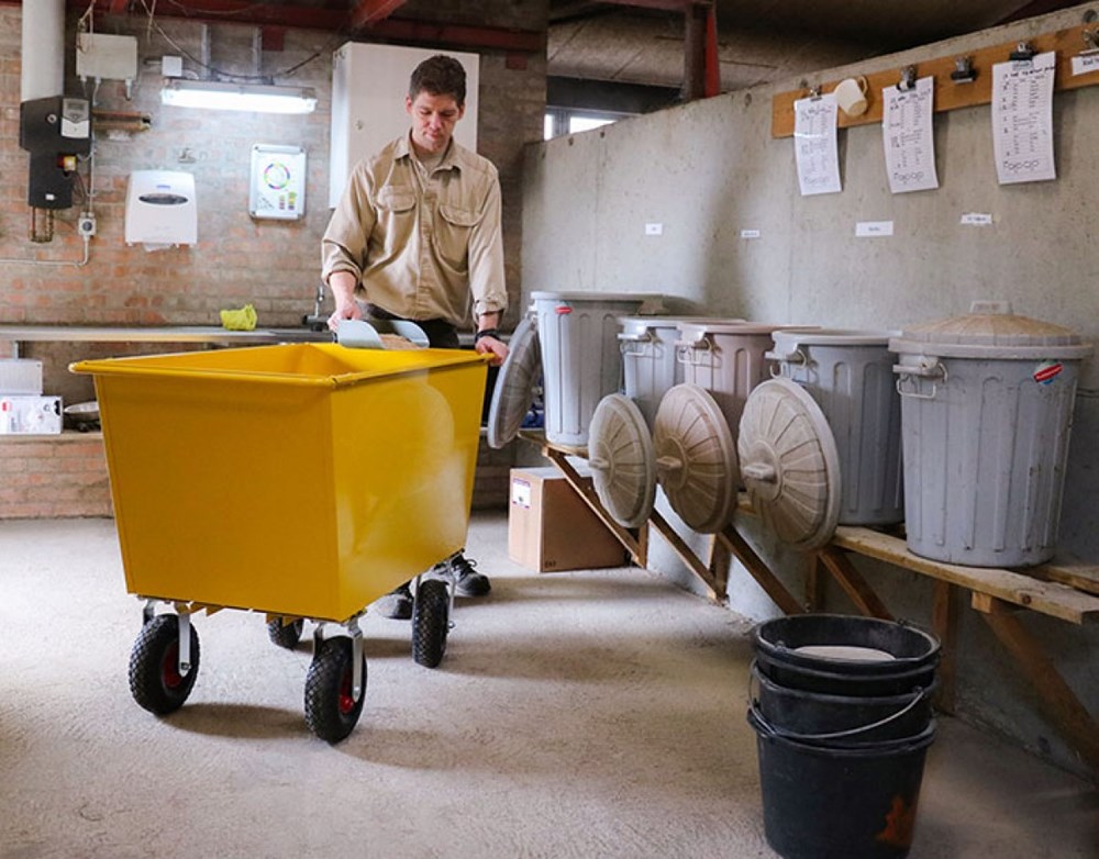 Robusta carriola per mangimi in acciaio per il trasporto efficiente di mangimi, cereali e materiali simili.