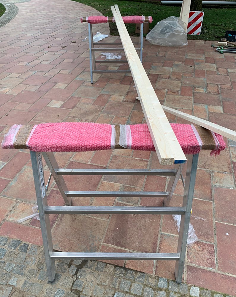 Cavalletto in alluminio con ampio spazio di appoggio per assi da ponte o attrezzature.