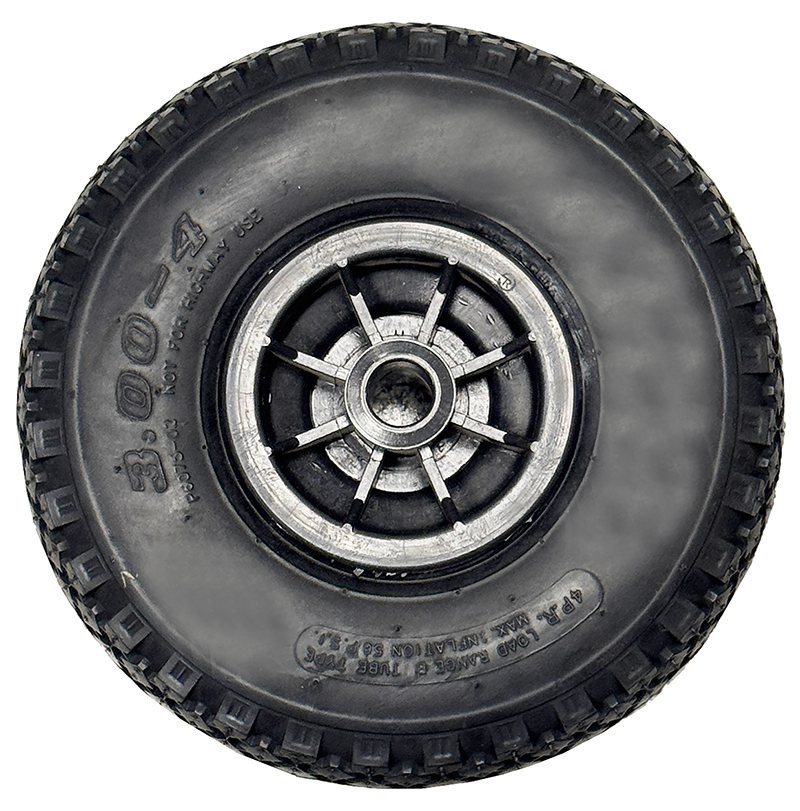 - Ruote pneumatiche in gomma rinforzata a 4 tele riempite ad aria.