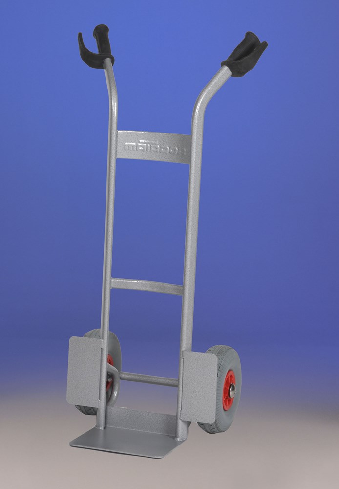 Carrello professionale in acciaio verniciato con polveri epossidiche. Dotato di manopole antinfortunistiche ovali in gomma naturale con paramano di sicurezza. Gomme piene antiforatura con portata Kg 150 cad. Ø 260x85 mm con mozzo in ferro e cuscinetti a rulli. La struttura è costituita da robusti tubolari ovali saldati. Il telaio è curvo per poter trasportare anche bombole e barili.