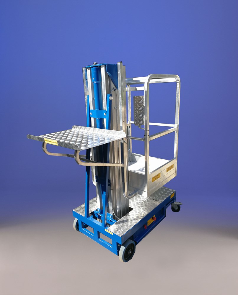 Dimensioni compatte (110 x 70 x 175 cm. di ingombro a terra) che la rendono facilmente trasportabile su furgoni di piccole dimensioni grazie al suo peso estremamente contenuto. Dotata di ampio piano di carico regolabile manualmente in altezza per operazione di picking tra le corsie di magazzini senza correre il rischio di scivolare con il carico in mano. Offrendo un' altezza massima di lavoro di 5 metri ed un estrema maneggevolezza queste piattaforme si prestano per lavori di manutenzione in aziende, uffici, magazzini e supermercati mentre il funzionamento a 24 V a batteria permette di utilizzarle anche in ambienti privi di rete elettrica offrendo un elevata autonomia.