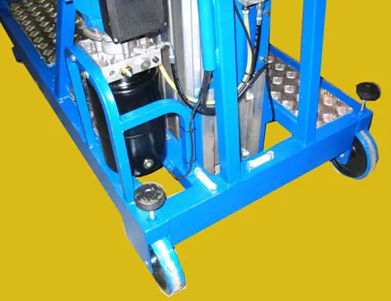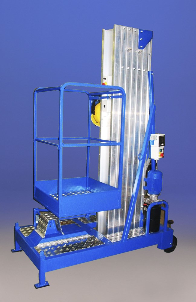 Con alimentazione a corrente alternata (o continua optional) è comandabile dal cestello mediante pulsantiera con comandi facilmente gestibili. Le ridotte dimensioni di ingombro consentono di passare attraverso spazi molto ridotti. La colonna portante è montata su rulli in nylon autolubrificante per consentire un minor gioco e quindi una maggiore stabilità. Ciò anche in condizioni di temperature estreme (caldo e freddo). Non necessita di stabilizzatori per cui è utilizzabile anche dove gli spazi sono più limitati. Può essere spostata a spinta o tramite una leva di comando.