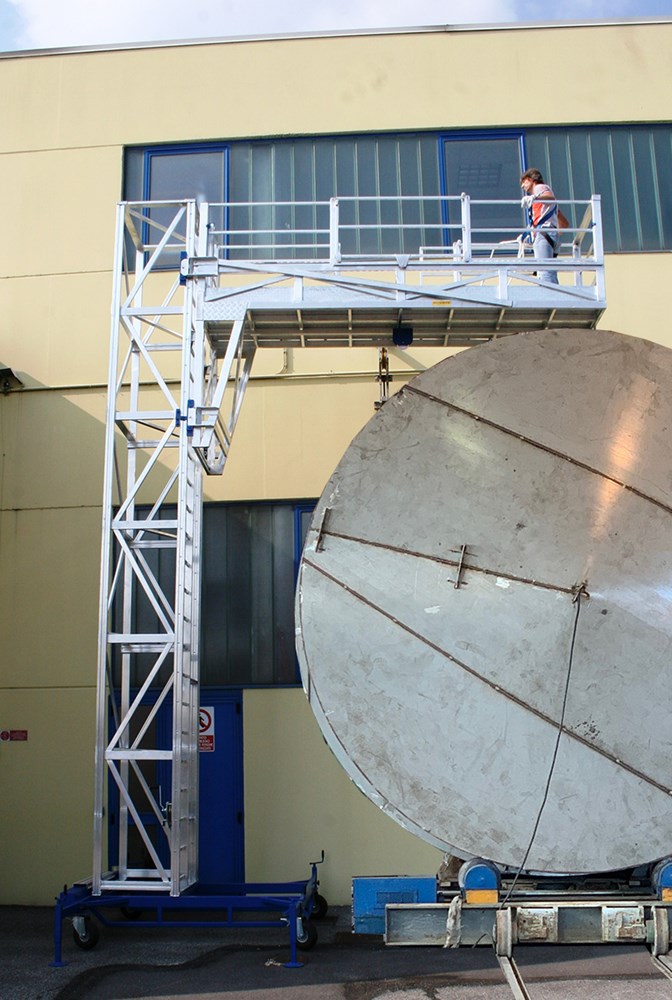 Il telaio in acciaio verniciato sostiene una colonna in alluminio nervato con piattaforma in alluminio completa di parapetti apribili su tutti i lati.