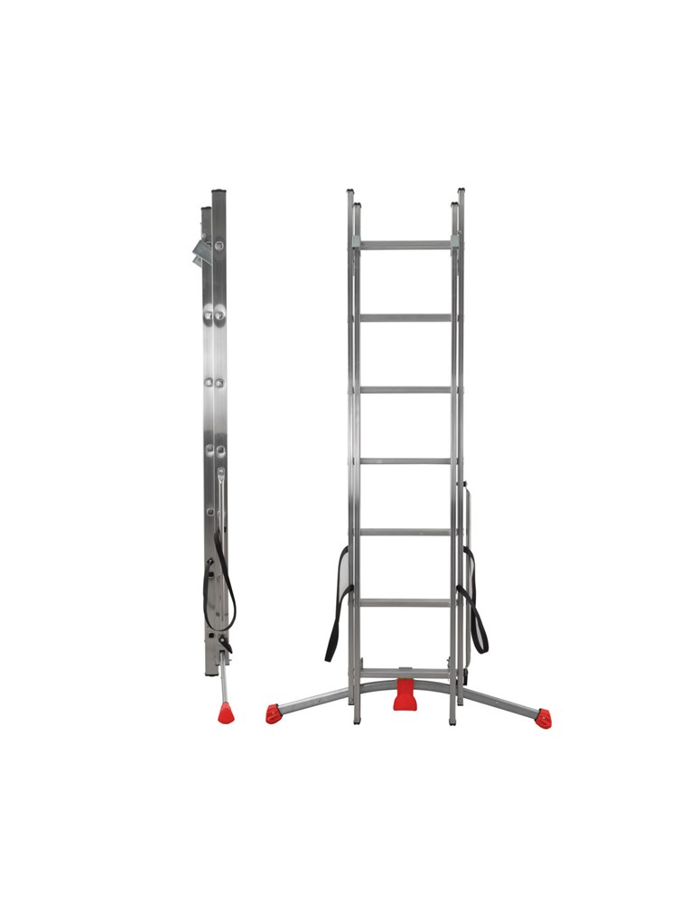 Scala in due tronchi, posizione in scala d'appoggio, doppia e zoppa grazie all'allargatore di base regolabile a pedale.