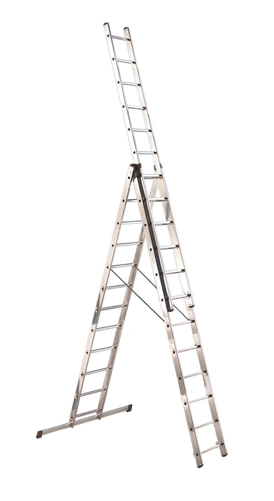 Scala a 3 tronchi trasformabile ribordata, utilizzo domestico e hobbistico, dotata di stabilizzatore di base, cinghie antiapertura, altezza massima a sfilo m 5,65
