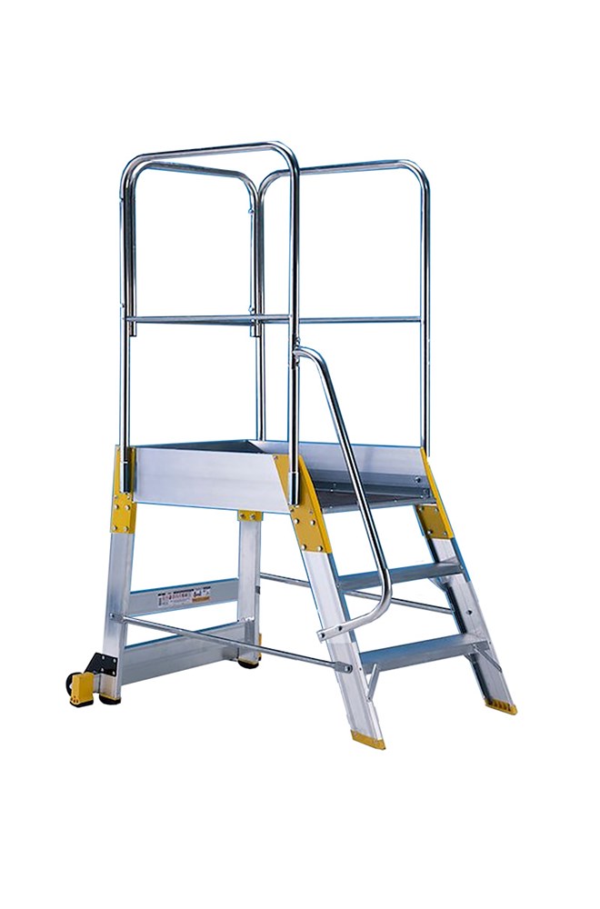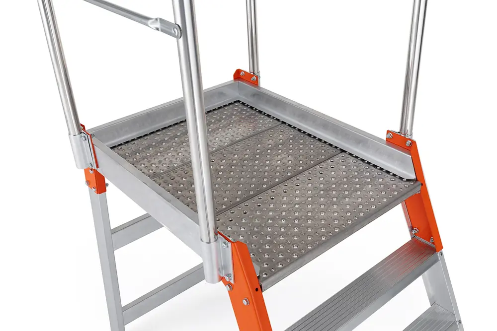 Piattaforma da cm 61x78, fermapiedi e guarda-corpo di protezione alto 1 metro che avvolge l’operatore proteggendolo su 3 lati.