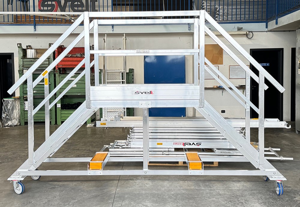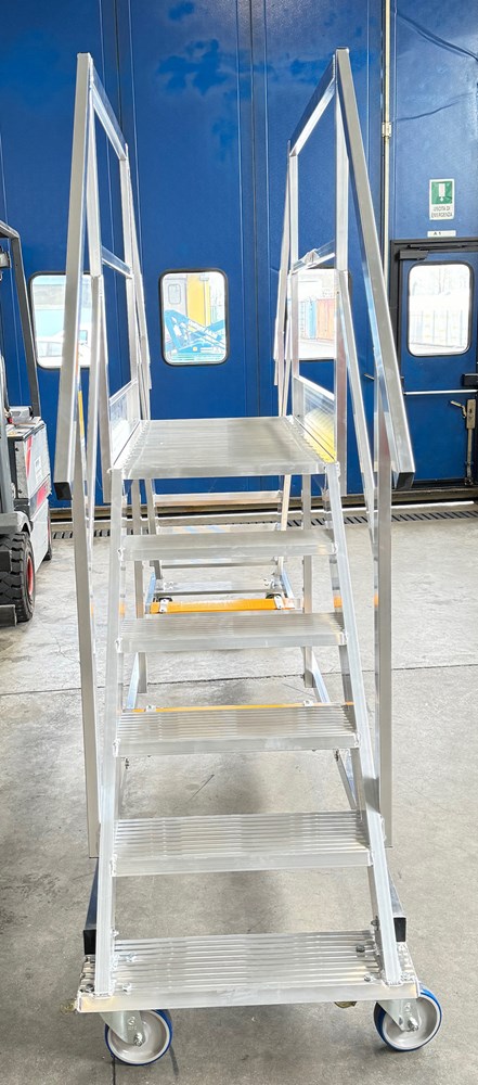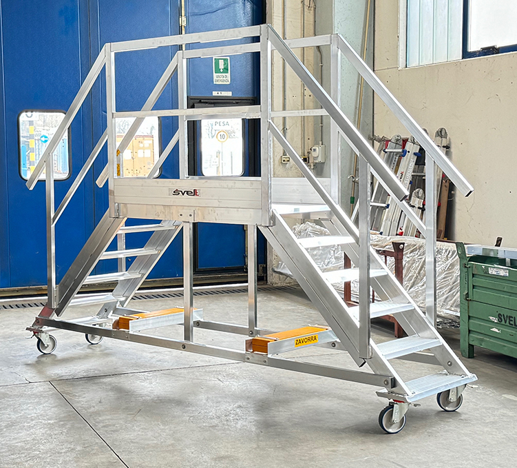 Scala in alluminio estruso nervato saldato a TIG dotata di gradini piani, piattaforma, guardacorpo e corrimani.