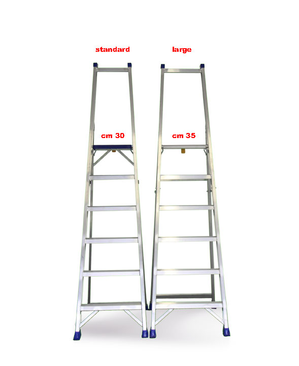 Progettata per uitilizzo professionale intensivo presenta una larghezza maggiorata di 50 mm che consente di montare una piattaforma in alluminio più ampia e comoda. L’operatore lavora con un livello di comfort riscontrabile solo su scale a castello. Le gambe si trovano avvolte all’interno dei montanti con ampio spazio per i movimenti.