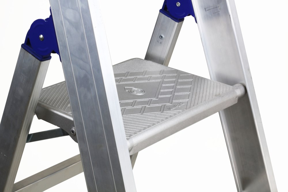 Scala per utilizzo professionale intensivo in alluminio ad alta resistenza. Larghezza maggiorata. Con 4 ruote, piattaforma e parapetto