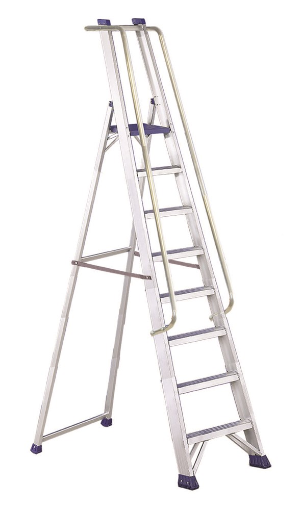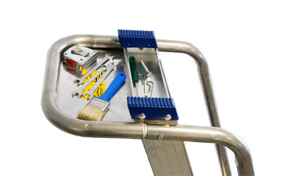 Provvista di piattaforma automatica cm 28 x 25,5 e pianetto portattrezzi con portata kg 10, corrimani e guarda-corpo.
