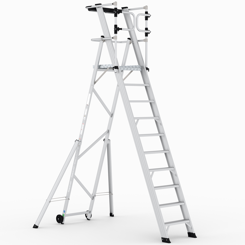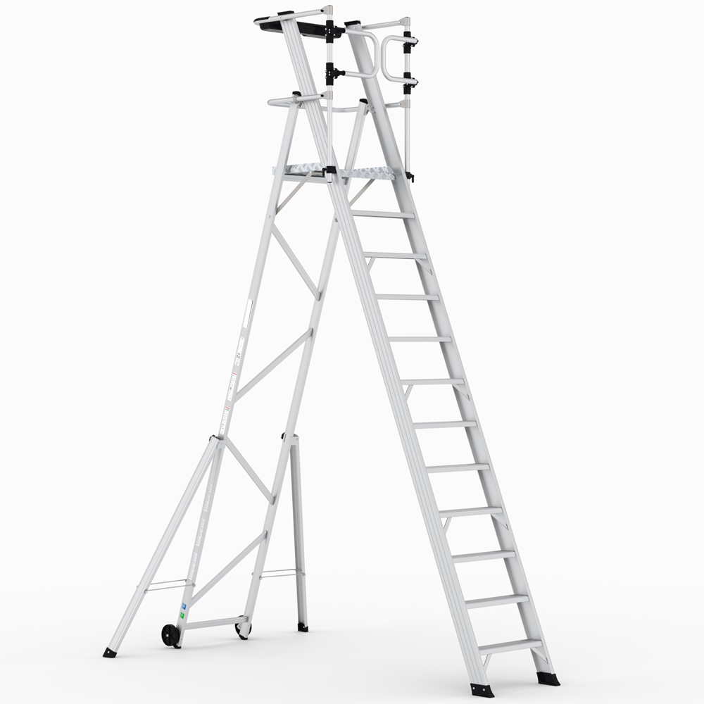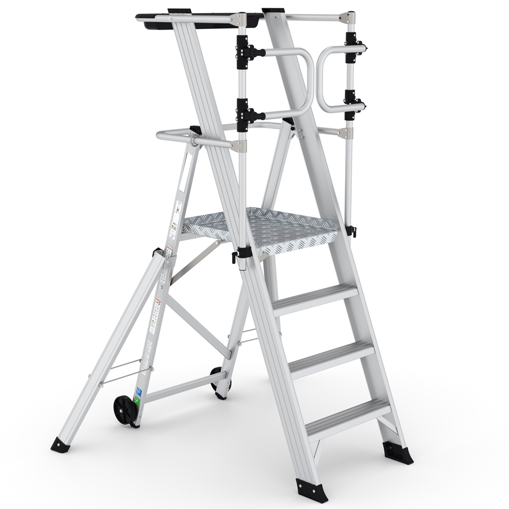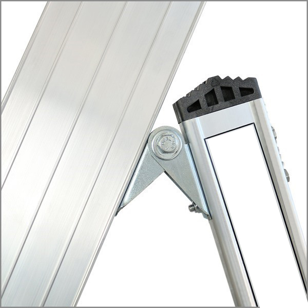 Scala con piattaforma in alluminio, allargatori richiudibili, guardacorpo con larghezza e gradini piani maggiorati