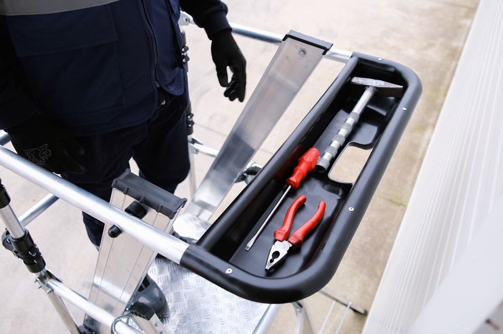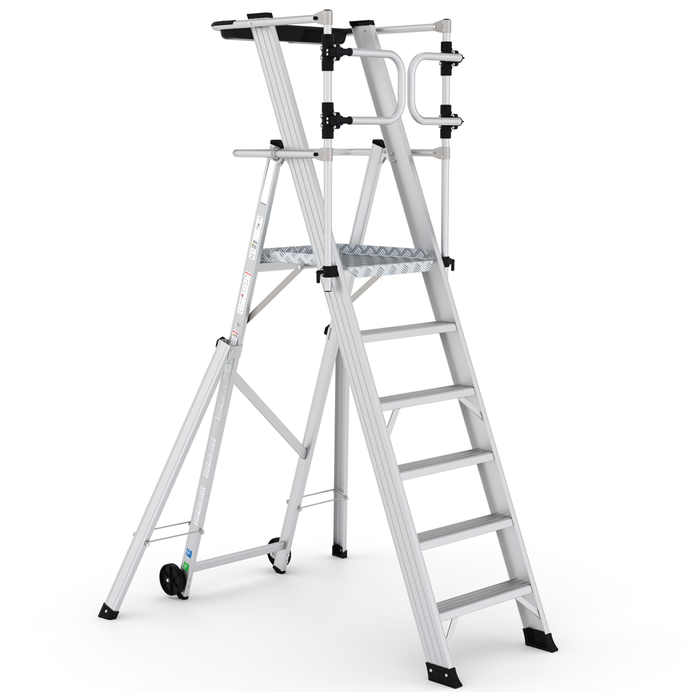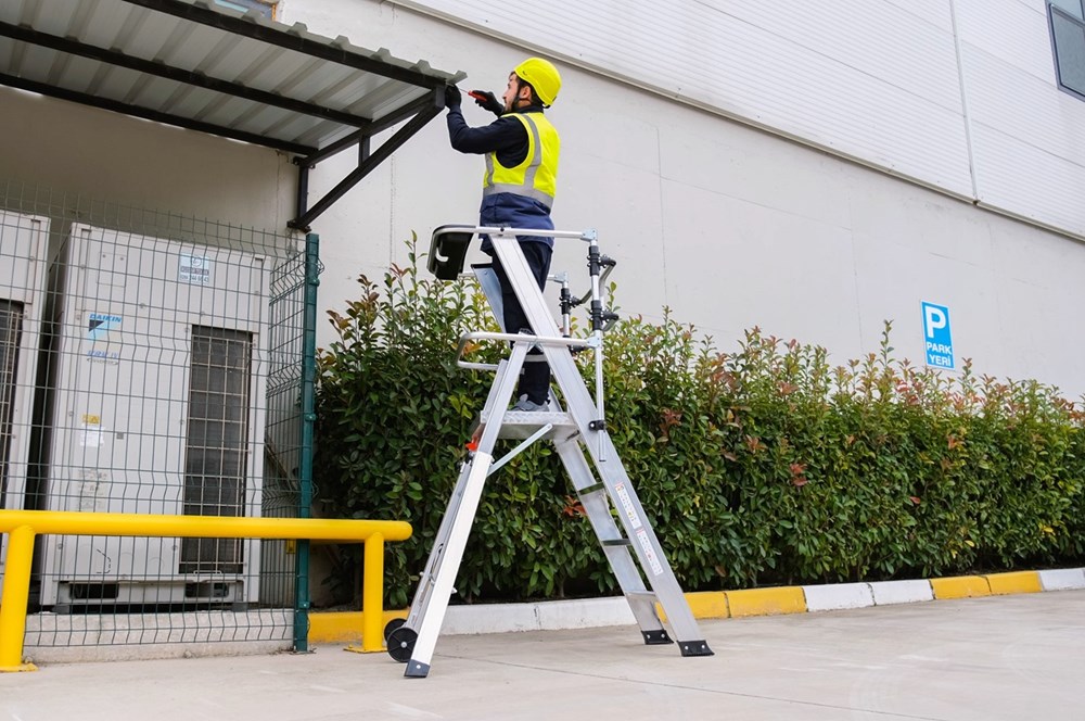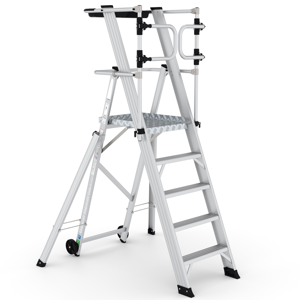 Scala con piattaforma in alluminio, allargatori richiudibili, guardacorpo con larghezza e gradini piani maggiorati
