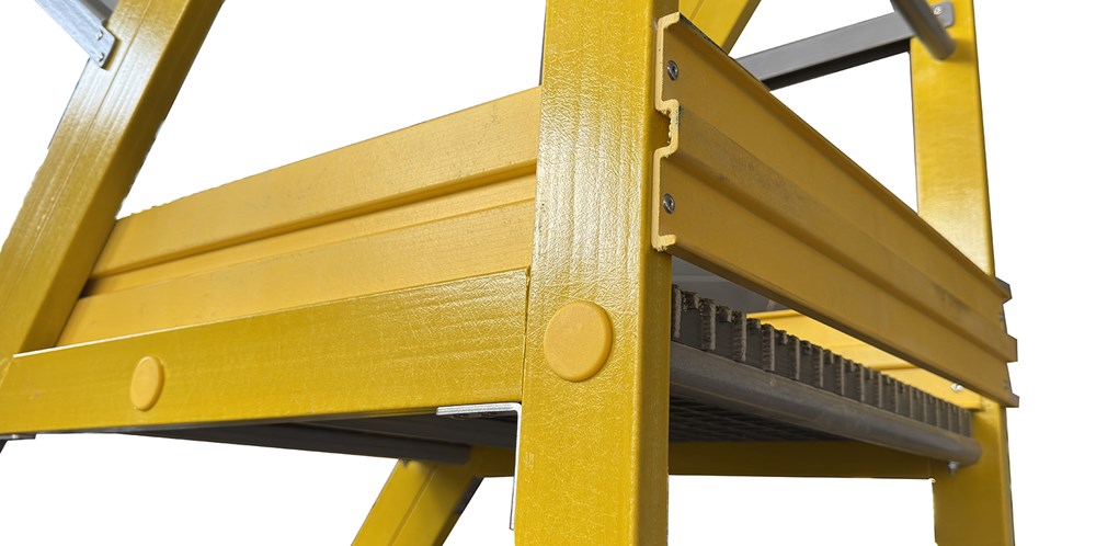 L'ampia rampa di salita, il guarda-corpo parapetto da cm 100 e l'ampia piattaforma di lavoro in vetroresina cm 60x80 ne permettono l'utilizzo come scala a castello.