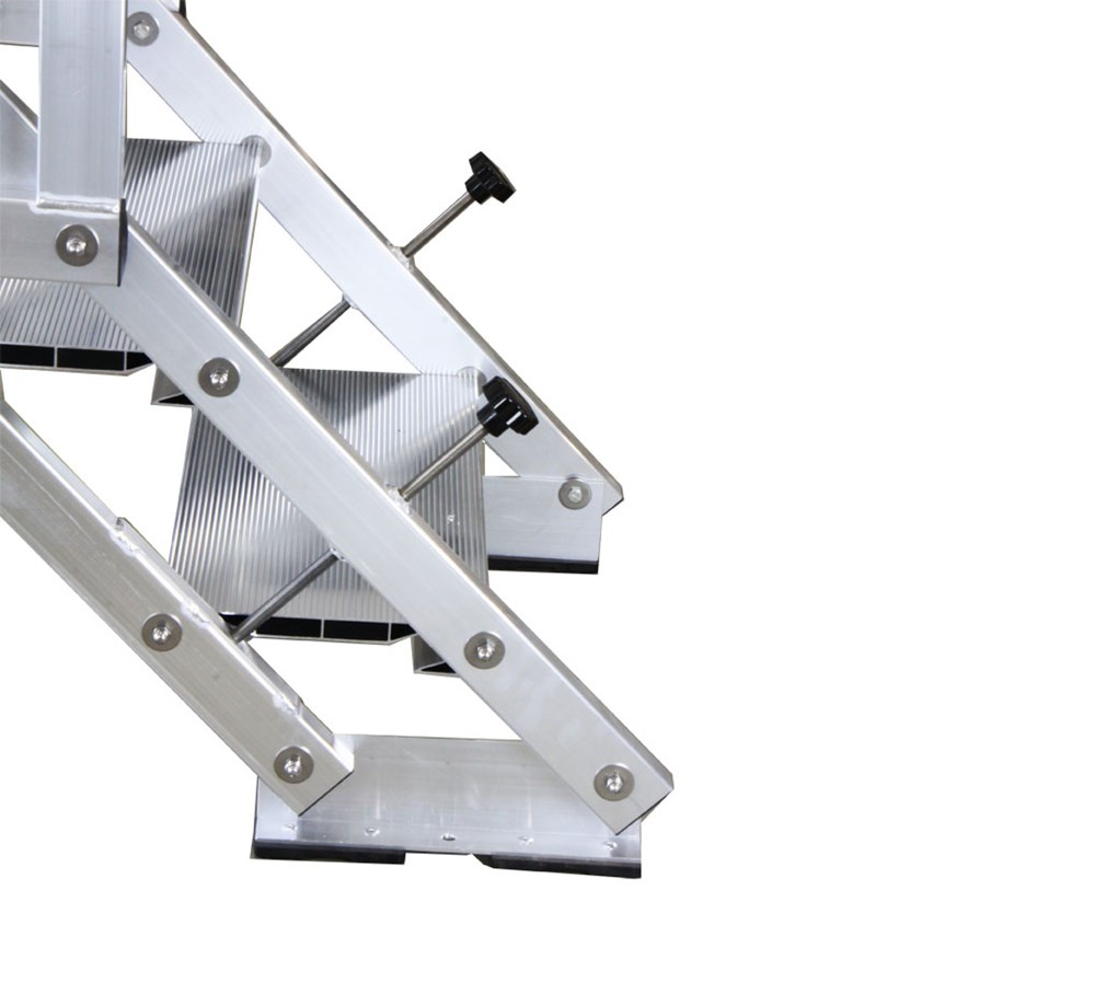 I tamponi d’appoggio inferiori sono in PVC, basculanti, si adeguano alle asperità del terreno e conferiscono alla scala grande stabilità.