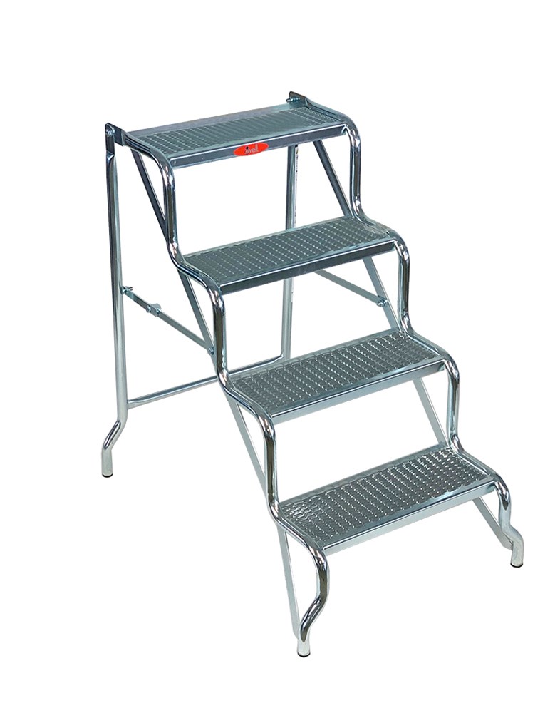 Sgabello 4 gradini in acciaio zincato, gradini ampi grigliati, dispositivo di sicurezza anti- chiudibile, base allargata con piedini antisdrucciolo, ideale per cantieri edili