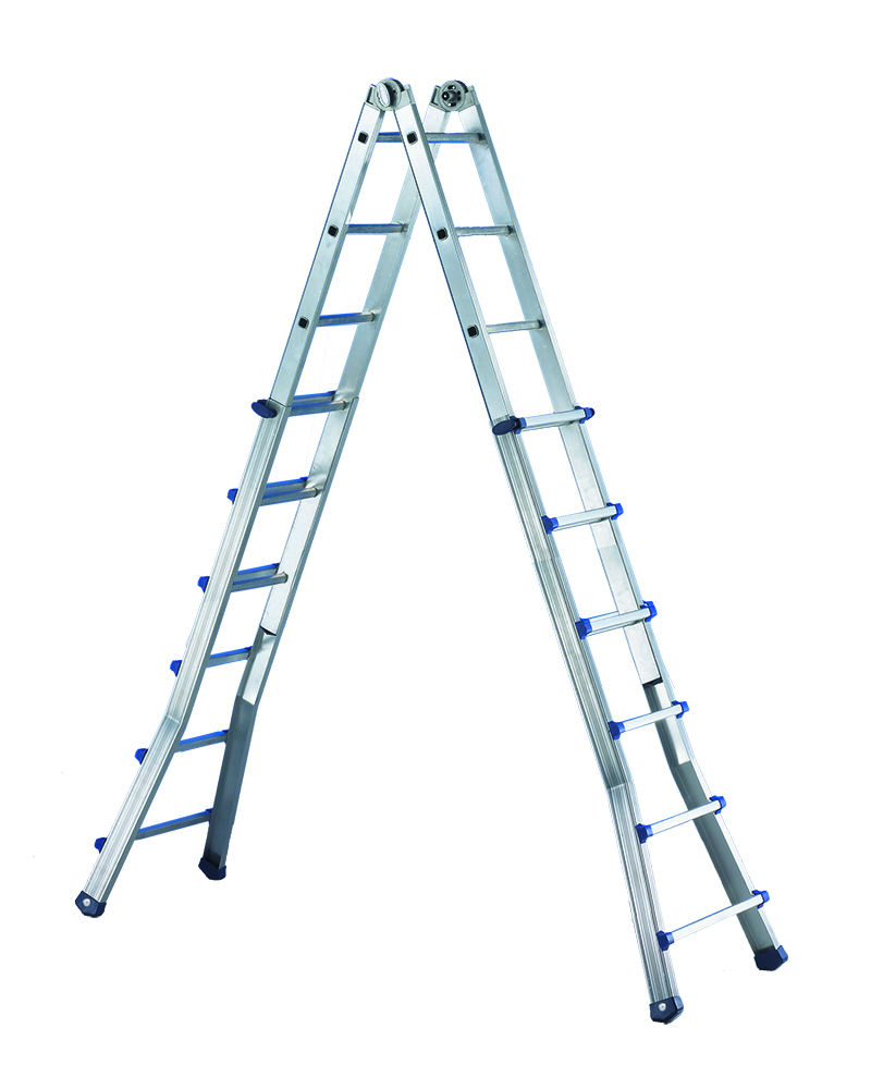 Scala telescopica multiposizione con base allargata. Utilizzo professionale intensivo, profili maggiorati, utilizzabile a sfilo, cavalletto e zoppa