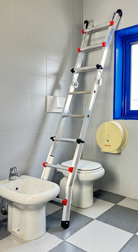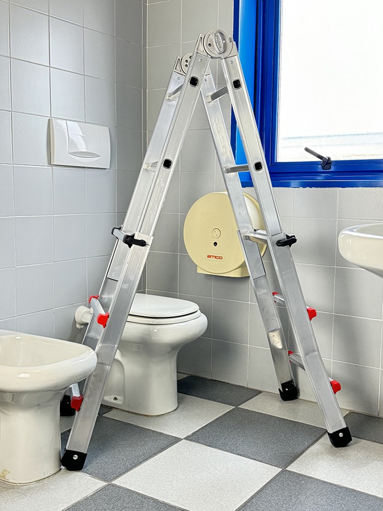 Scala telescopica multiposizione (6+6) con base stretta per utilizzo professionale in spazi ridotti. Utilizzabile a sfilo, a cavalletto e zoppa su scale.
