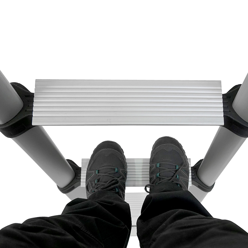 Scala telescopica ultracompatta con gradini da 80 mm e stabilizzatori telescopici richiudibili
