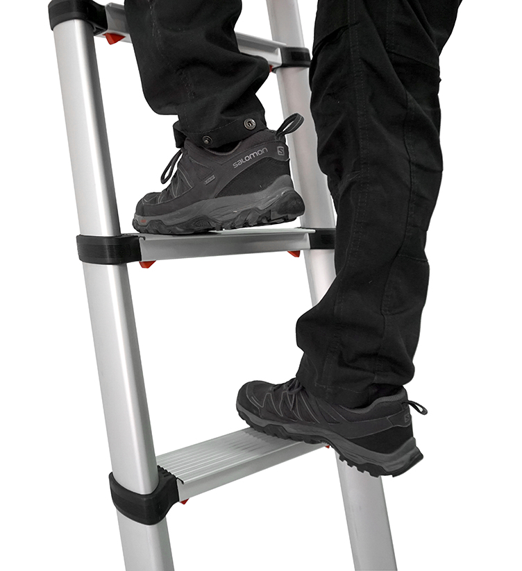 - Posizionare il piede sul primo piolo della scala ed estendere le sezioni piolo per piolo iniziando dal piolo superiore.