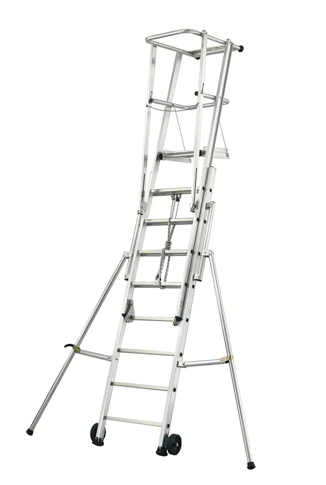 Scala telescopica in alluminio dotata di guardacorpo, piattaforma e allargatori di base integrati.