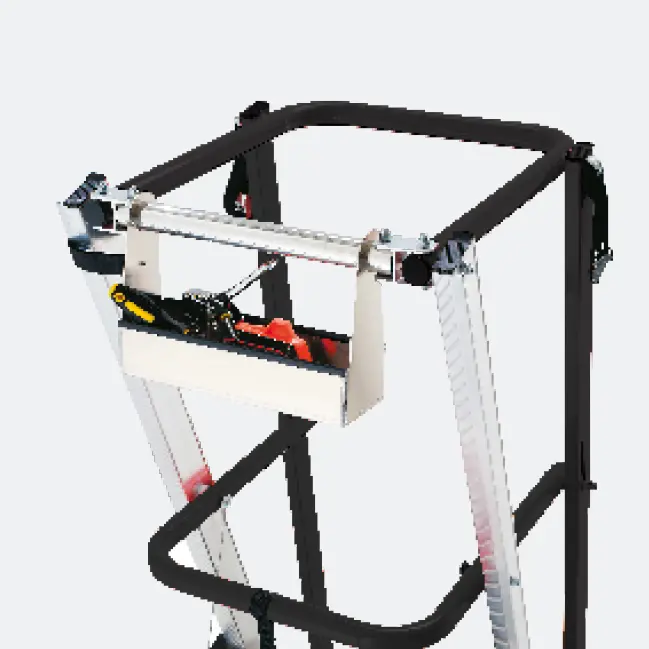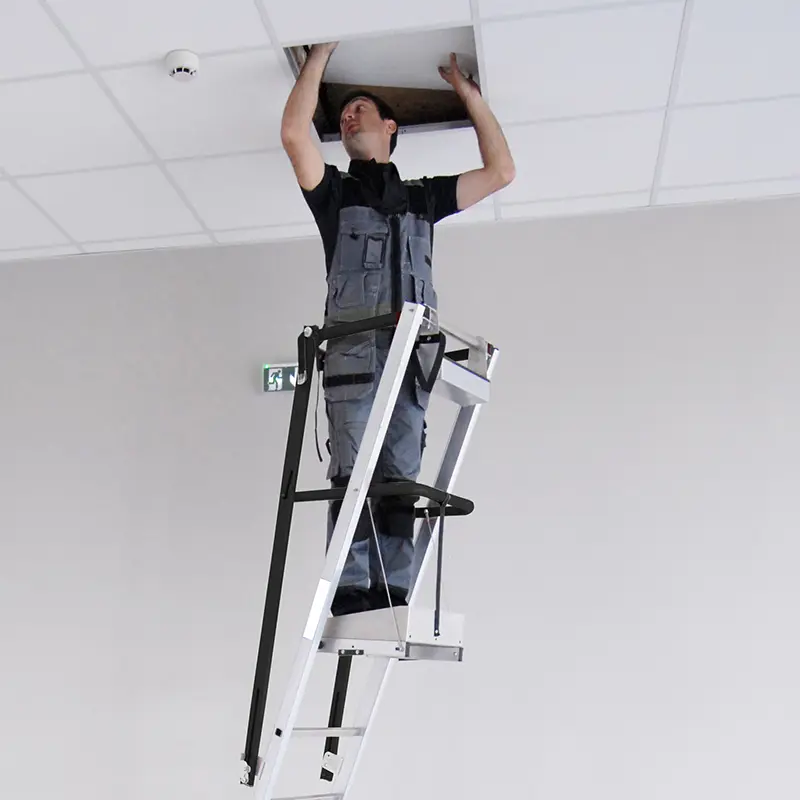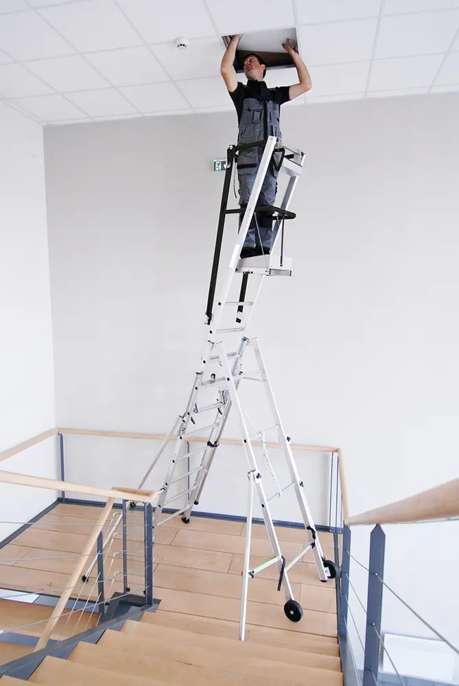 Postazione di lavoro a metà tra una scala e una piattaforma aerea.