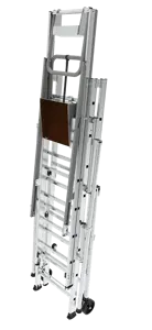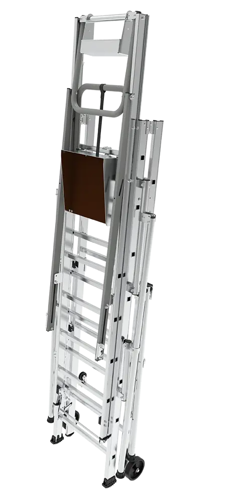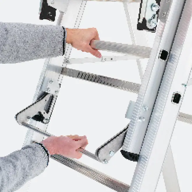 La scala autoportante interamente in alluminio è dotata di guardacorpo, piattaforma e allargatori di base integrati.