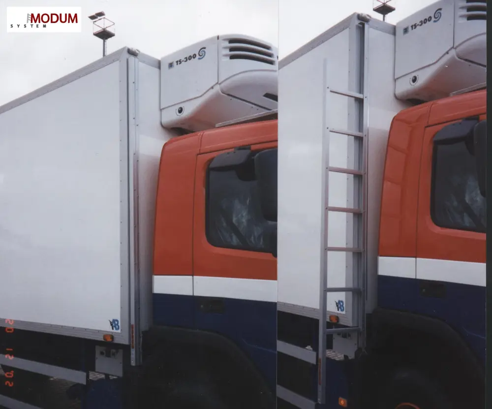 La scala rimane fissa alla parete dell'automezzo in modo stabile, discreto ed “invisibile”. In caso di bisogno la scala si apre in pochi secondi azionando una cerniera di apertura. Modum è dotata di serratura di sicurezza con doppia chiave in modo che l’accesso sia consentito solo a personale autorizzato. Modum si apre e si blocca in pochi secondi per un accesso rapido e sicuro. La scala si apre verso il basso e rimane in posizione per effetto della forza di gravità e del peso della persona.