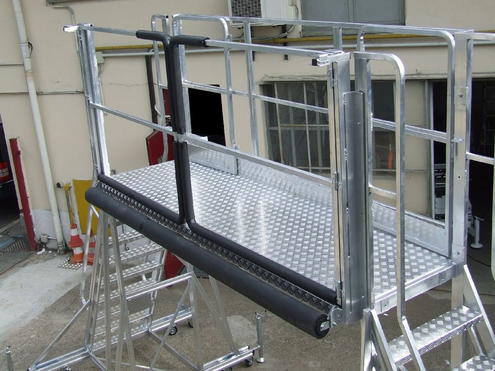 - Piattaforma in alluminio con fermapiede, paraginocchia e parapetto di protezione